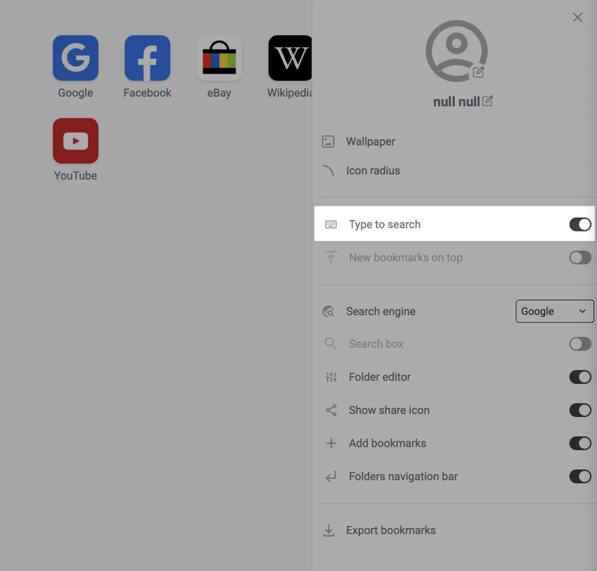 Even if the search bar is hidden, Bookmer’s smart search can still be activated automatically. As soon as you begin typing anywhere in the interface:
